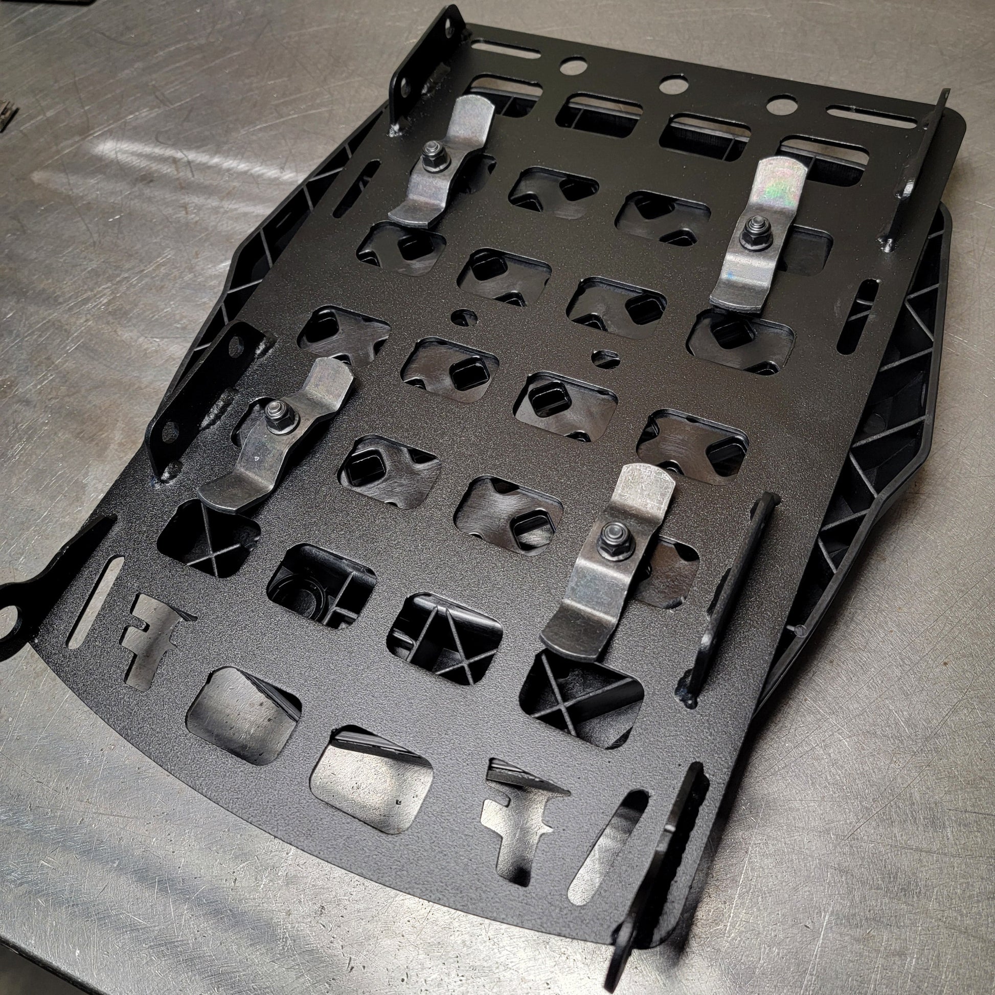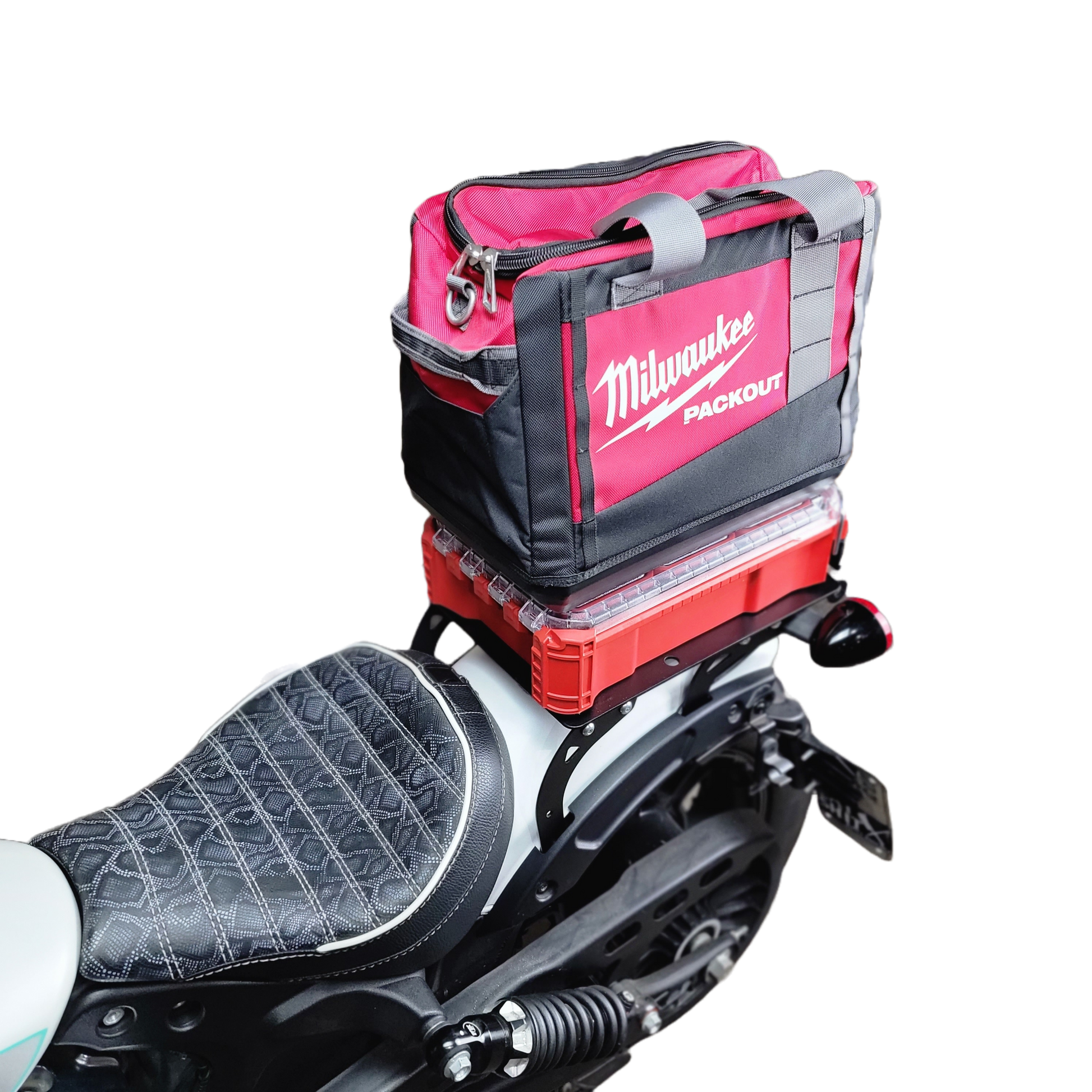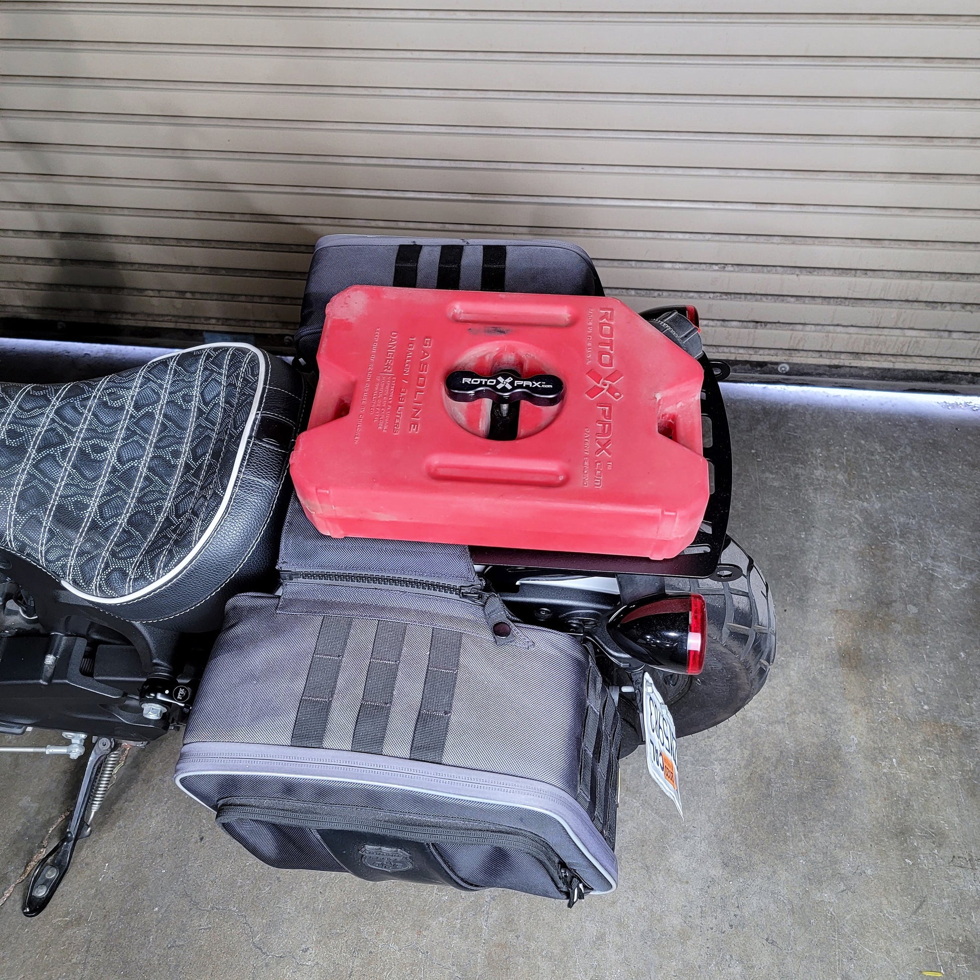 The Fastlab Rear Luggage Rack is what all Indian Scout owners have been waiting for. No more dinky racks that only hold a purse. This rack has two layout options, a universal Molle pattern to mount nearly any bag with straps or tie downs, or a Milwaukee Packout version that allows you to mount any small size Milwaukee Packout bag, box, or cooler. Since the rack creates a flat surface, most universal throw over saddle bags can be used and still clear the high Scout Exhaust. Also included in the Molle layout is the hole pattern to bolt a Rotopax Fuel Can Mount straight to the plate. We all know the Scout fuel tank is lacking and now carrying extra fuel has never been easier.