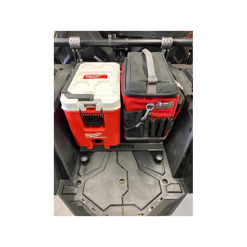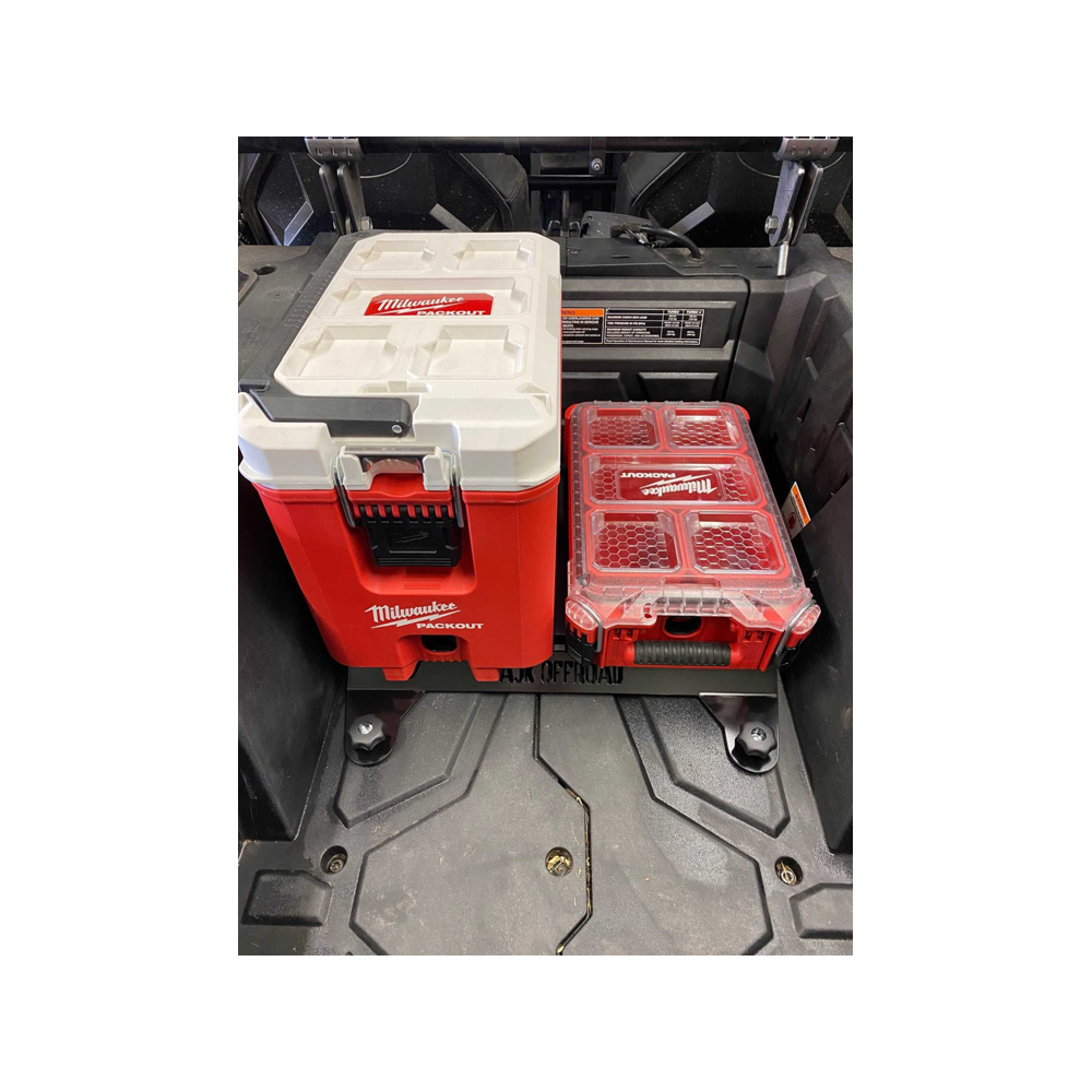 Our Milwaukee Packout Mount is the perfect storage solution. This mount uses existing mounting holes so no drilling is required. You can purchase our mounting system to bolt this packout mount directly to your bed. This is a very simple install. We CNC Laser cut our Milwaukee Packout Mount in house from 10 gauge P.O. steel then powder coat it black. This style sits only 1.0" from the bed of the Polaris RZR and is considered our short version. This short version will only accept some full size storage boxes. If the Milwaukee box has extra large sides this mount will not work, you will need the tall version. The tall version accepts any size packout box.