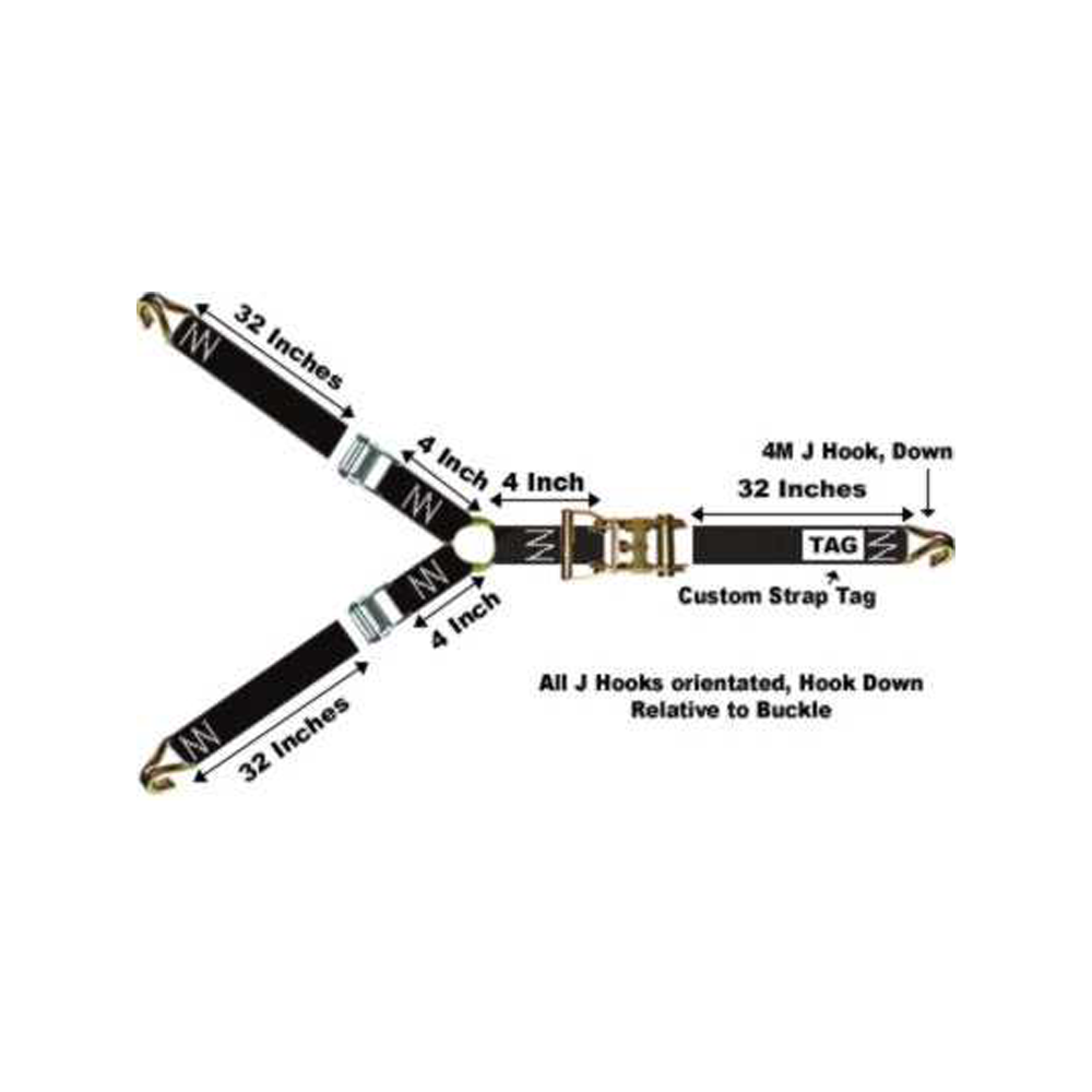 1.5 Inch Y-Shaped 3-Point Ratchet Tie Down, CRW15-4M 1.5 Inch Wide Handle Ratchet, 4M, CHJ15-4M Double J Wire Hook, Hook Facing Down, On End Of Each Strap, CHO2-10M O-ring At Center Of Y, CS15-1M Cam Buckle On Y-Straps For Easy Adjustment, Fixed End Strap 0.33 Ft (4 Inches), Adjustable Strap 2.67 Ft (32 Inches), Total Strap Length 3 Ft (36 Inches), CW15-K4PE 1.5 Inch 4M Black Polyester Tie-Down Webbing, Made In The USA.